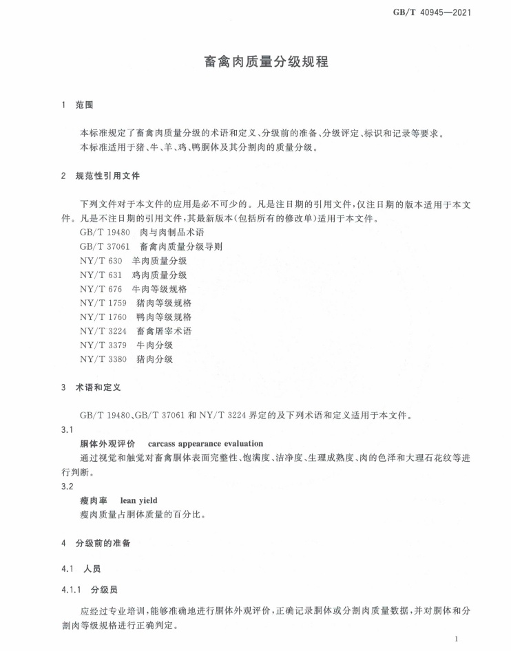 《畜禽肉質(zhì)量分級(jí)規(guī)程GB/T40945-2021》主要包含以下幾個(gè)方面的內(nèi)容: